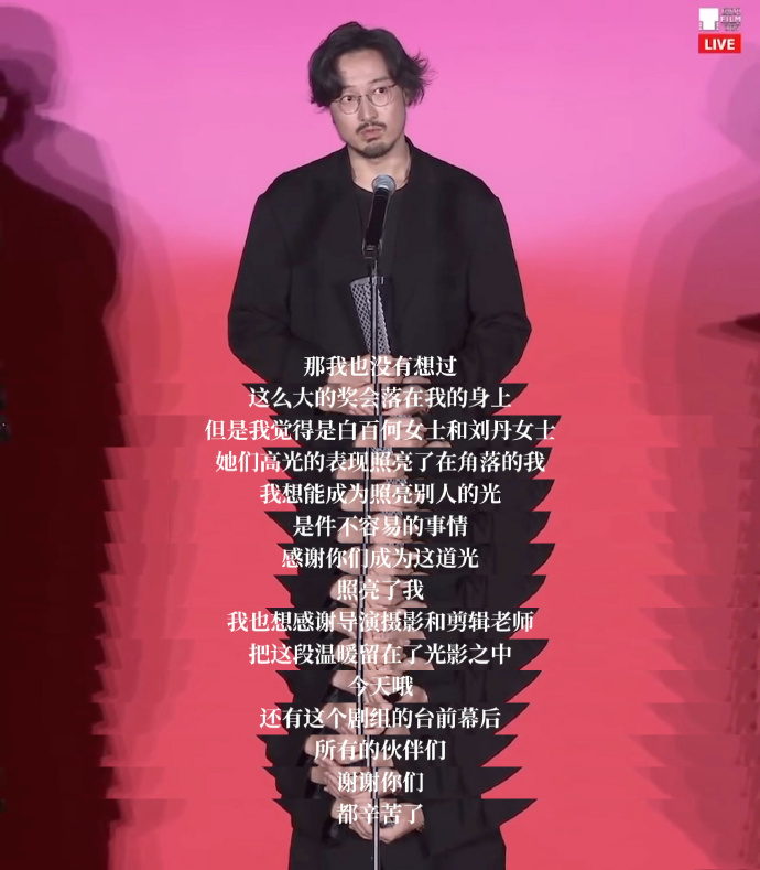 站上领奖台上的他,感谢了自己的家人,也特别感谢了电影里合作的两位女演员白百何与刘丹。