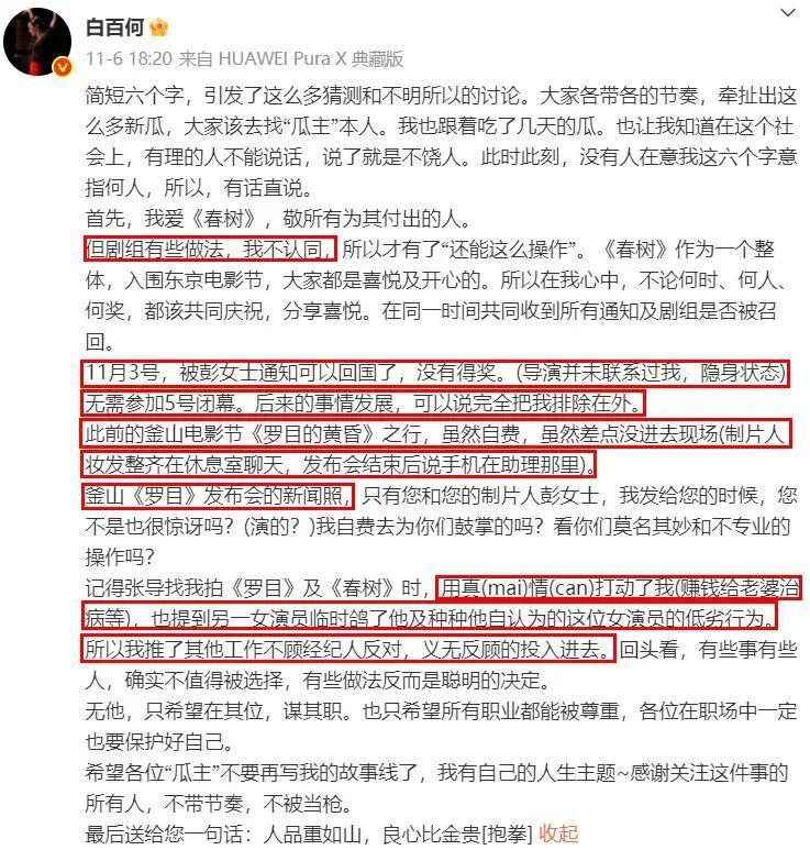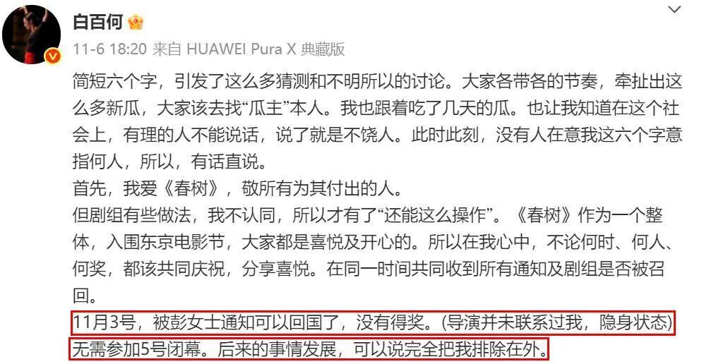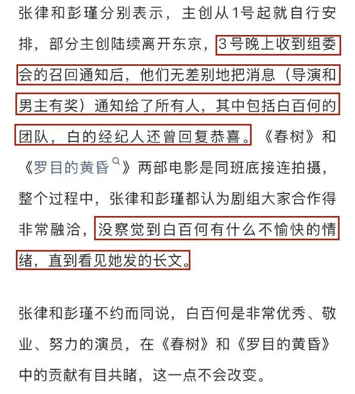 因为从前面白百何的微博来看,她想表达的是剧组明知拿了奖却不告诉自己,而不是现在所曝光的已告知。