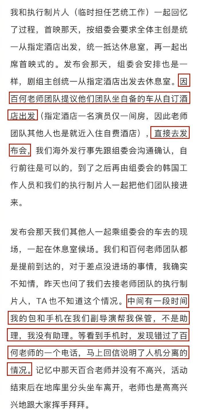 白百何自行从酒店出发到现场,制片人中途将手机交给他人保管,错过了她的电话。