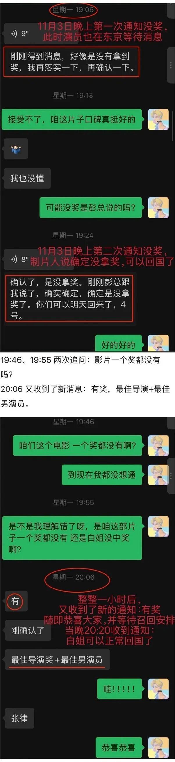 11月3日晚上,剧组确实告知了白百何经纪人,影片拿下最佳导演和男演员奖,经纪人表示了恭喜。