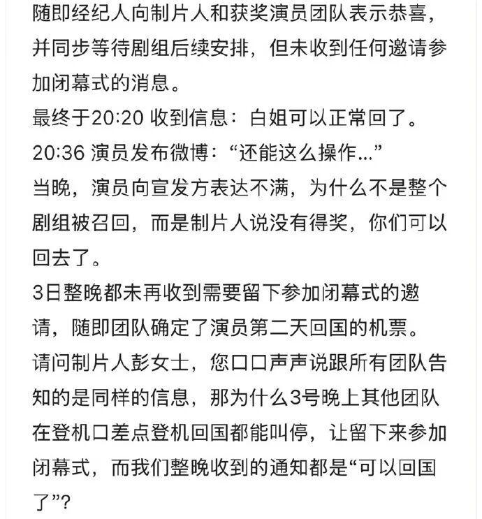 但是,颁奖典礼与闭幕式还未开始,白百何及其团队就买机票回了国。