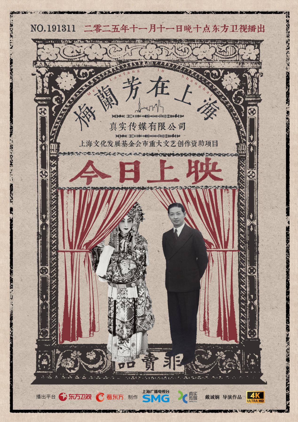 为纪念梅兰芳先生访美演出95周年暨中国人民抗日战争胜利80周年,由上海广播电视台真实传媒出品,戴诚娴导演的纪录片《梅兰芳在上海》将于11月11日晚10点在东方卫视“新纪实”时段和看看新闻、看东方等网络平台播出。《梅兰芳在上海》是对梅兰芳上海记忆的一次探寻,也是与梅兰芳的一次重聚。