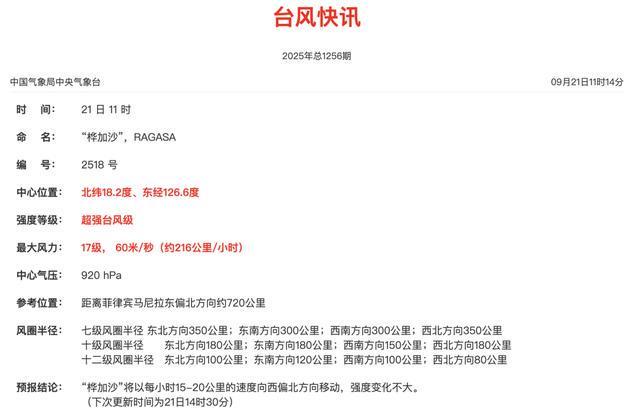 根据中央气象台观测,截至9月21日11时,今年第18号台风“桦加沙”已加强为中心附近最大风力17级的超强台风,广东省气象部门预计,受其影响,9月23日至25日,广东海面和陆地将迎来一次严重风雨过程,各地需提前做好巨灾防御准备。
