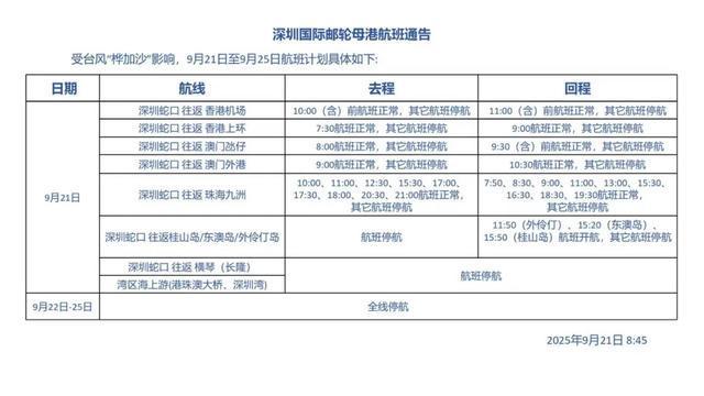 受今年第18号台风“桦加沙”影响,9月21日深圳国际邮轮母港航班有调整,9月22日至25日全线停航,9月26日天气趋于稳定,请旅客合理安排出行计划。