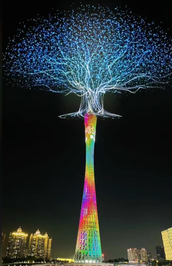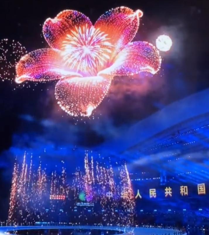 从无人机编队勾勒出港珠澳大桥的跨海长虹到地面影像绚烂绽放成广州市花木棉红的炽热火云;