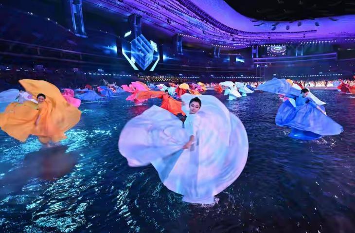 时间回到11月9日晚的广东奥体中心,当开幕式宣布正式启动的那一刻,上千平方米的核心表演区突然泛起粼粼波光。
