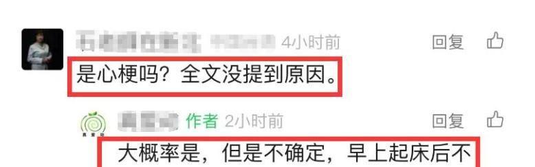 有网友在其好友发布的纪念文章下留言询问死因,特别提到是否因心肌梗塞所致?