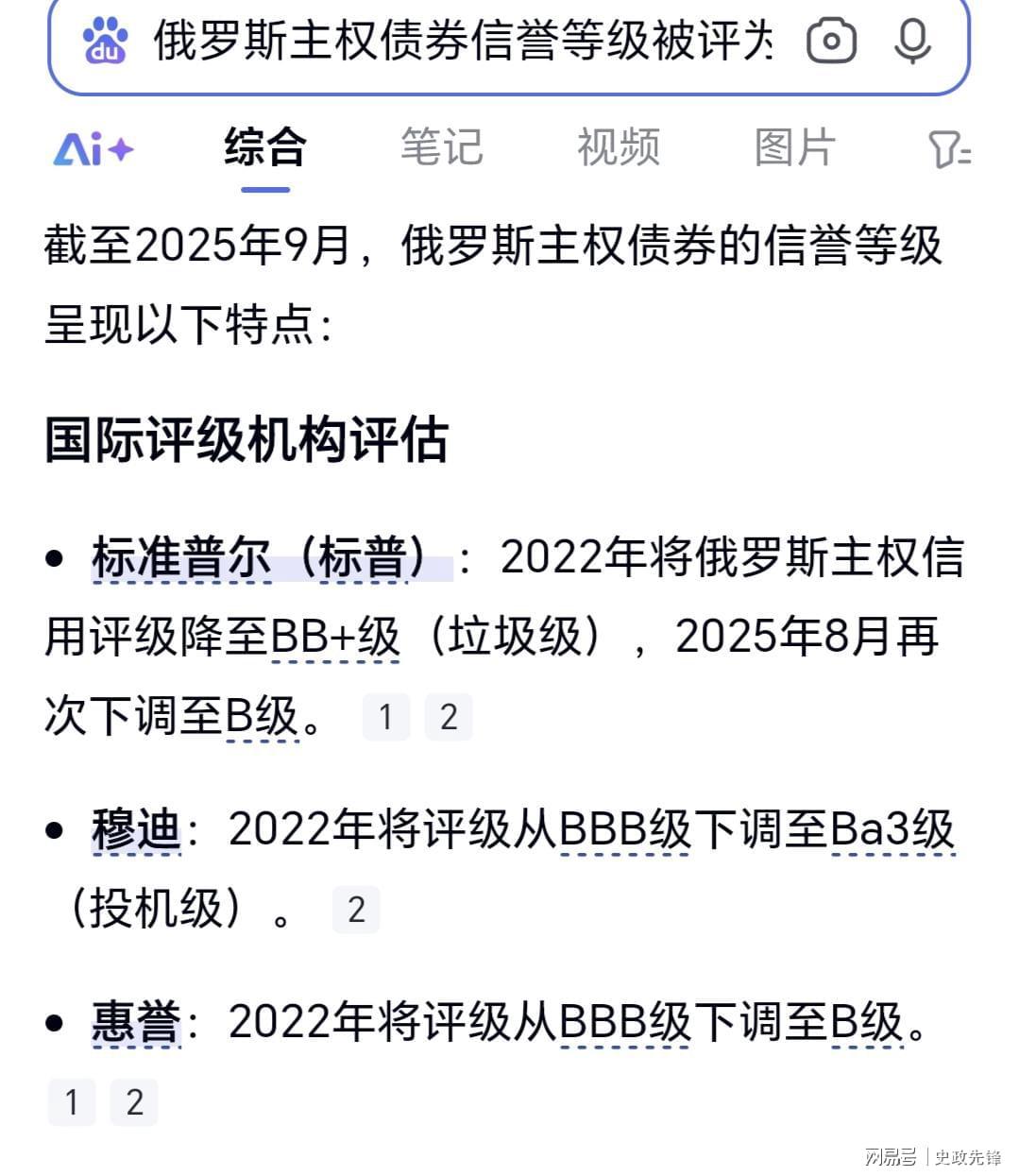 中国给予俄罗斯主权债券3A评级(与恒大相同),但国际三大评级机构的态度截然不同:穆迪2022年将其评为‘垃圾级’,惠誉同年3月下调至C级,标普则自2022年4月15日起取消对俄所有公司评级,包括主权债券。