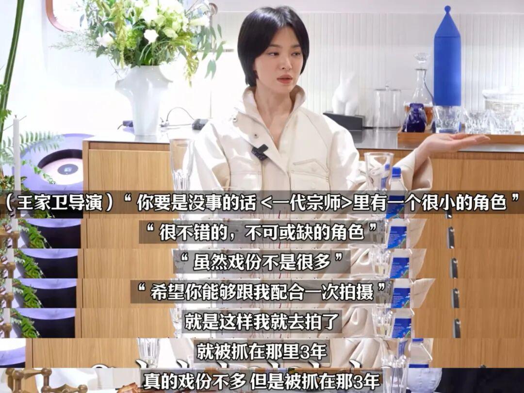 当年在拍摄《一代宗师》时,收到邀请的宋慧乔本以为只需要拍摄很短的时间,毕竟是一个很小的角色,于是带着“王家卫导演拍电影的现场是怎样的”的好奇心进入剧组。