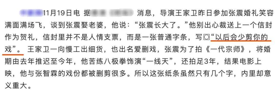 膈应人的是,张震结婚时,王家卫送来礼物,本以为是什么大礼,结果是一张破纸条,上面写着:以后会少剪你的戏。