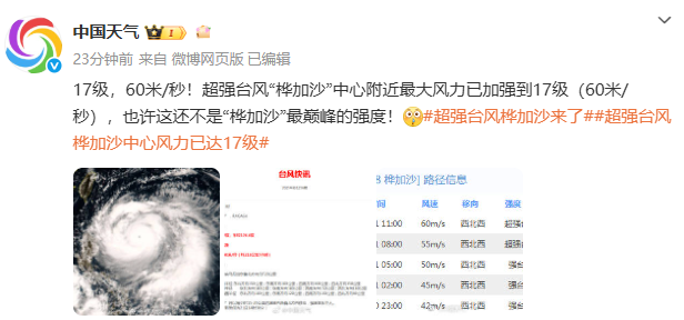 根据中央气象台21日11时的台风快讯,“桦加沙”目前最大风力已达17级(60米/秒)。@中国天气 表示,这可能还不是“桦加沙”的巅峰强度。