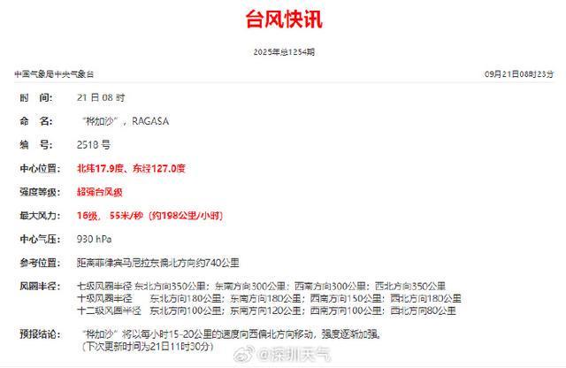 据中央气象台消息,“桦加沙”将继续以每小时15公里的速度向西北方向移动,强度持续增强。预计22日将穿过巴士海峡,23日凌晨进入南海东北部海面,随后趋向广东沿海地区。