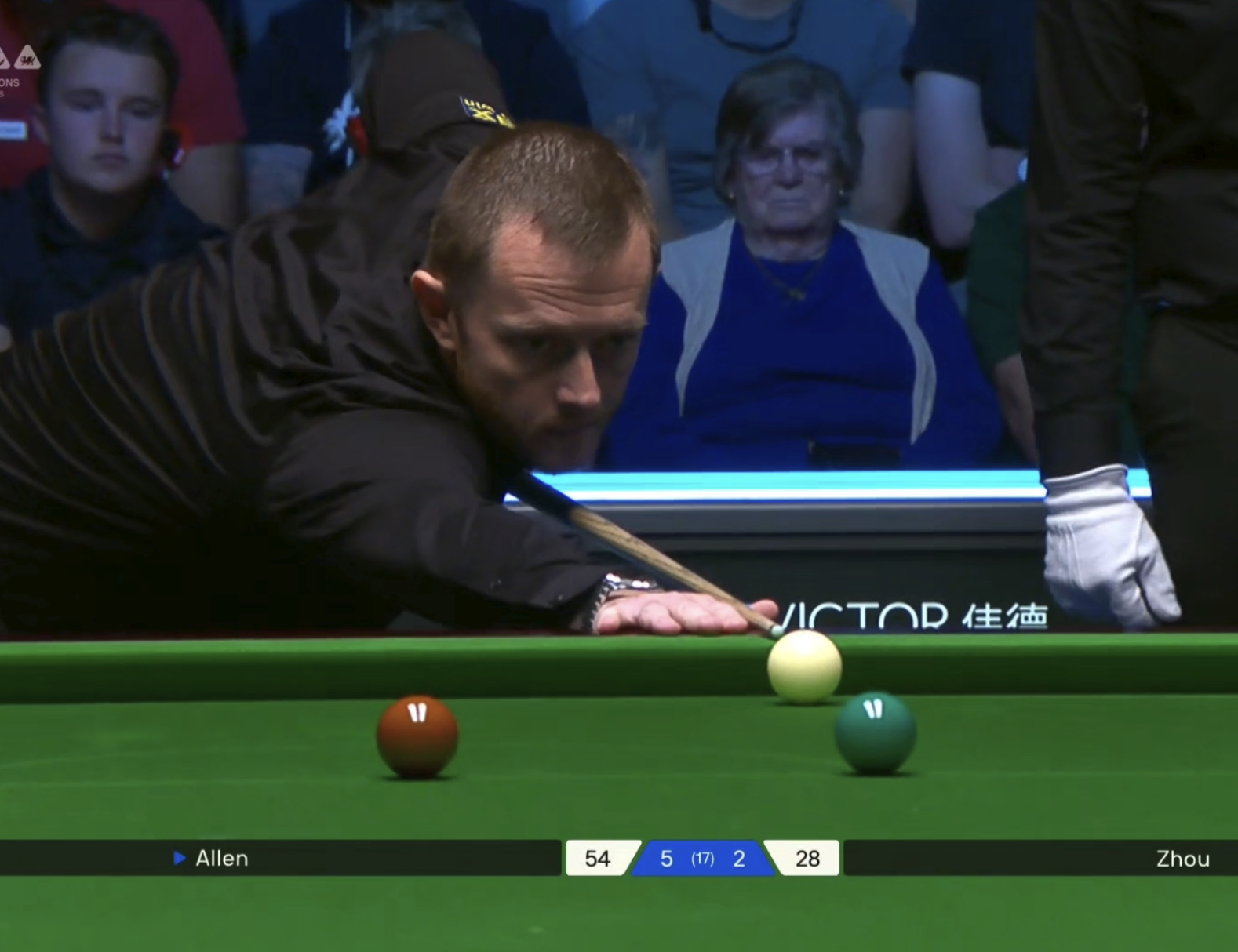 周跃龙曾3次打入公开赛决赛,均未能夺冠。这次与艾伦的较量,周跃龙在输掉首局后,拿下第2局将比分扳平。但在接下来4局较量中,我们看到了周跃龙在经验上的不足,还是不够沉稳,而艾伦则一直保持冷静,相比于周跃龙,他确实是见过大场面更多的选手,尤其是在本站比赛连续逆转的情况下,艾伦打得更稳,关键分可以把握住。周跃龙1-5落后,半场结束2-6。第一阶段的比赛,周跃龙打出2次单杆50+,艾伦首局单杆132分,之后有3次单杆50+。