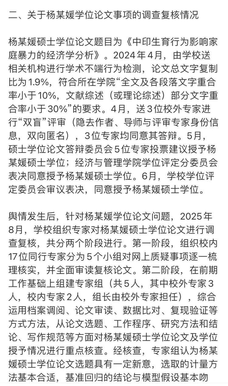 杨某媛硕士学位得以保留的依据是专家组‘无学术不端、数据可复现、结论有新意’的结论。然而,网友扒出的漏洞触目惊心:将《中华人民共和国婚姻法》错写为《离婚法》,世界卫生组织数据从36.1%篡改为28.3%,引用文献错误超20处,逻辑断层如‘东拼西凑’,甚至答辩专家曾提前指出‘问题太多,需大幅修改’。‘不抄袭’绝非学术底线,‘经得起推敲’才是。校方以‘1.9%文字复制比’证明无抄袭,却回避了‘为何百处漏洞能通过答辩、审核、学位认定全流程’的核心问题——导师、学院、学位委员会的集体‘流程摆烂’,比学术不端更伤学术尊严。