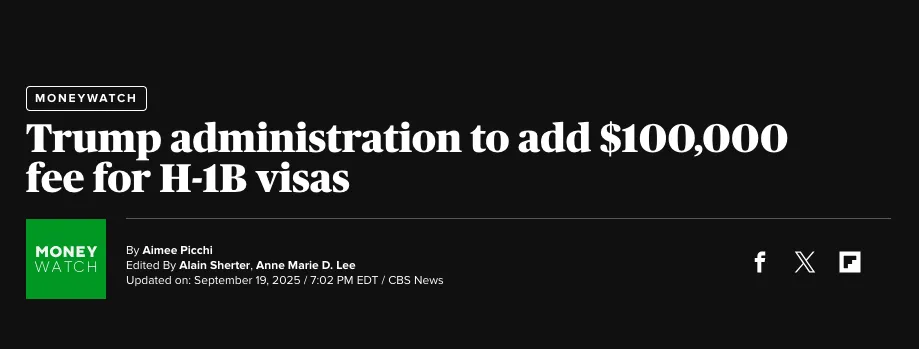 费用暴涨:H-1B签证费用从目前的1000-4500美元大幅提高到每年10万美元,这意味着一个三年签证的总成本高达30万美元(随后白宫澄清为一次性费用)。