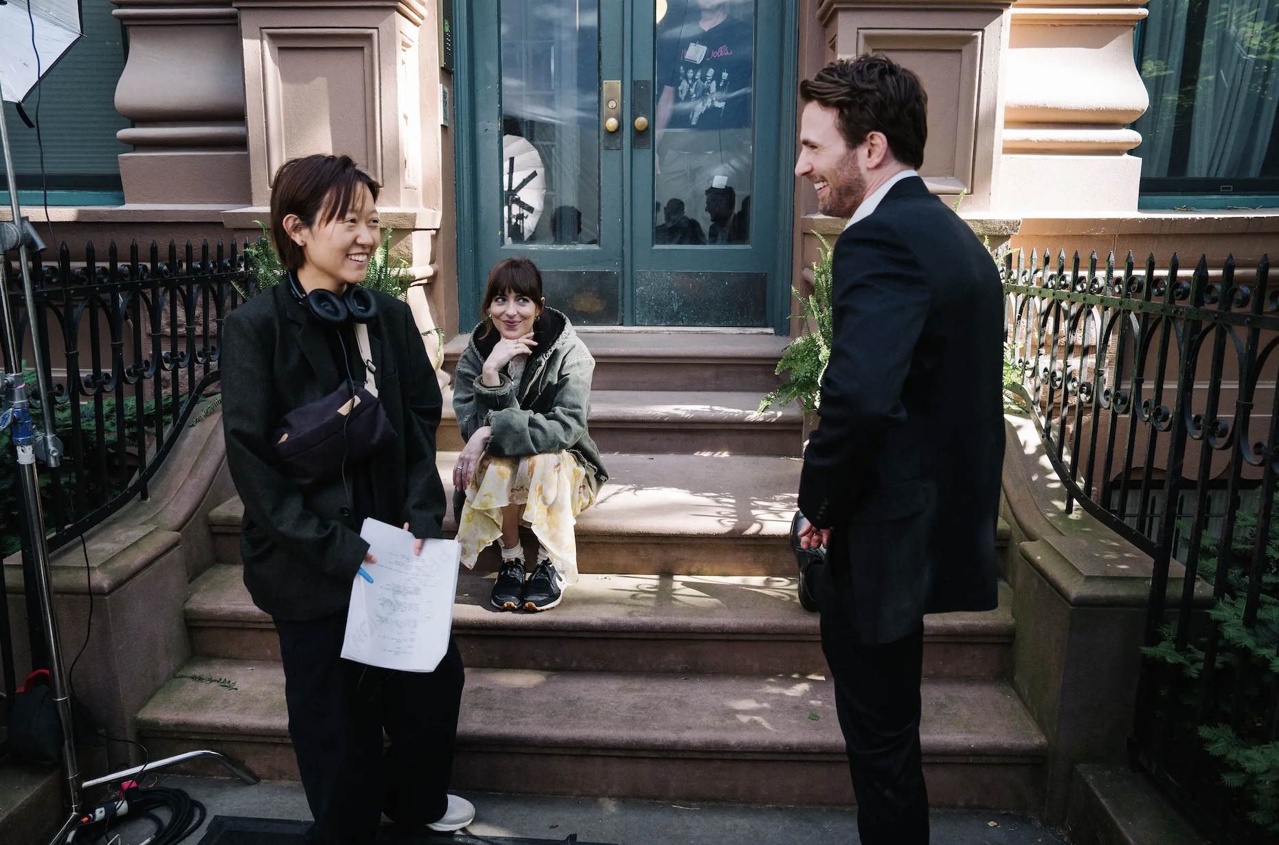 导演宋席琳和演员达科塔·约翰逊、克里斯·埃文斯在《物质主义者》片场。(图/A24)