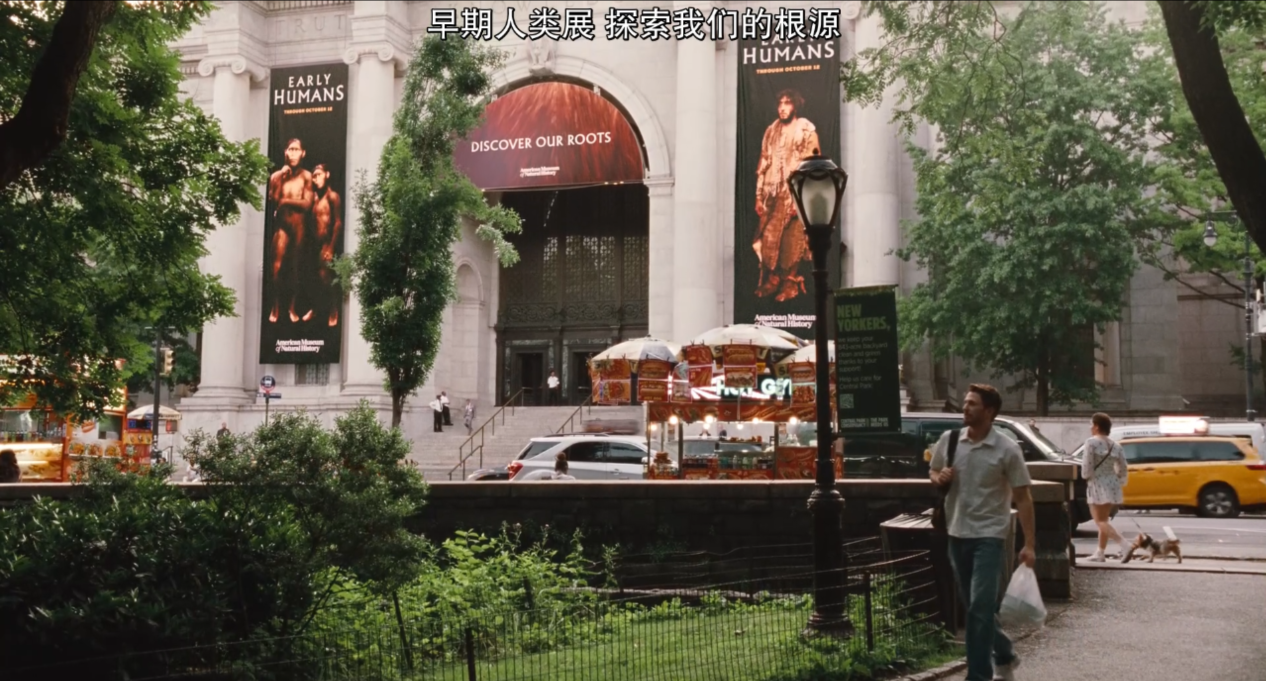 电影最后,约翰路过博物馆,里面正在举办“早期人类展”。(图/《物质主义者》远鉴字幕组)