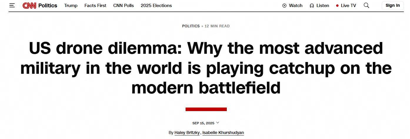8月27日,美国“政客新闻网”发表的长篇文章同样指出,美国在无人机研发、生产、训练和作战理论更新方面远远落后时代,且极度依赖中国生产的零部件。文章强调,乌克兰战场的经验表明,创新和快速适应能力是现代战争的关键,而美国军方尚未充分吸取这些教训,在防御无人机威胁方面也存在明显不足,这使得美国在与中国的无人机竞赛中处于严重劣势。若不改善低效繁杂的决策流程,即便投入巨资也无法解决问题。