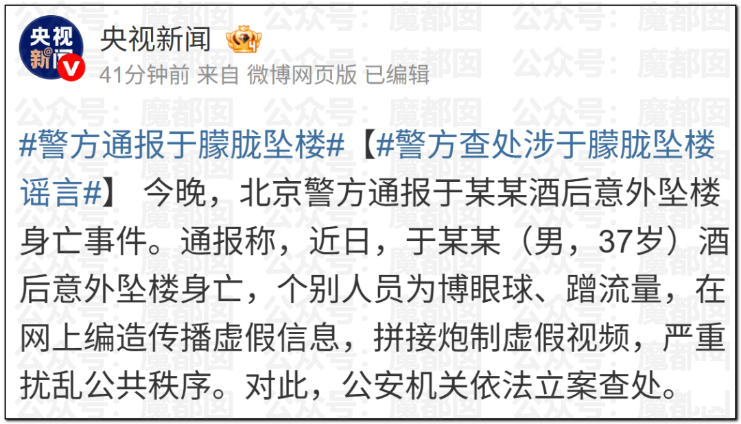 昨天的那篇文章大家不要再问了,也就是这么回事了,大家应该都懂的。还有,这几天每天都有几十位粉丝来要求我们为于朦胧发声,我们已经解释过很多遍了,这种事情但凡有蛛丝马迹涉及刑事案件的早就有通告了,奈何很多粉丝就是不信,一定要求按照她们的理解让我们“发声”,我们也是很无奈,幸好,今天当地警方发蓝底白字了,大家可以看看。