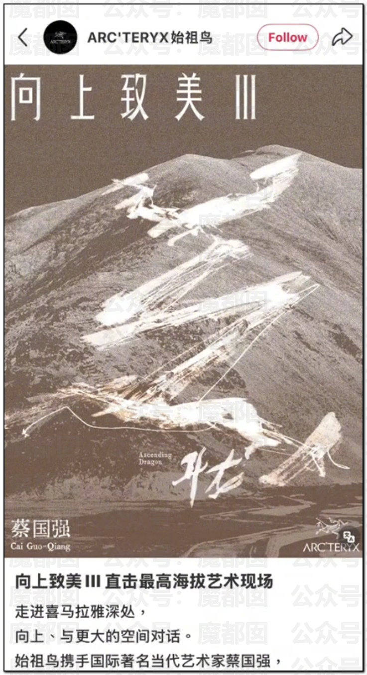 始祖鸟作为知名户外品牌,一直宣扬敬畏自然、热爱自然,当他们联手通过这场活动营销的时候,似乎都忘了雪山不是艺术家的试验田,更不是品牌提升格调的背景板。