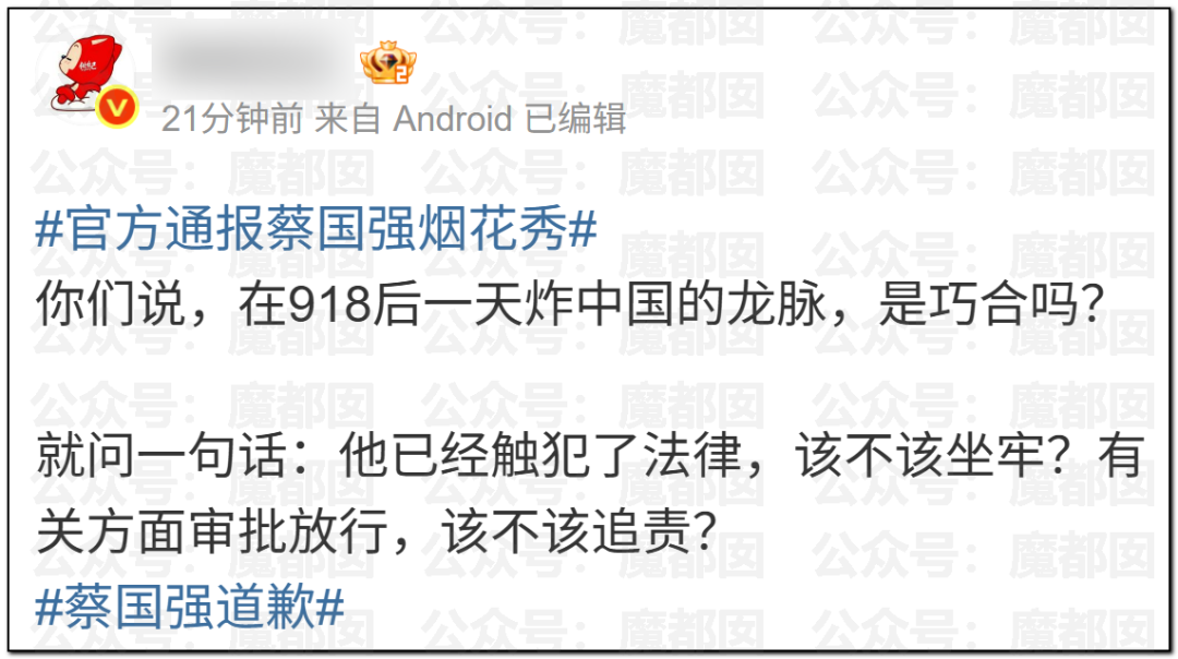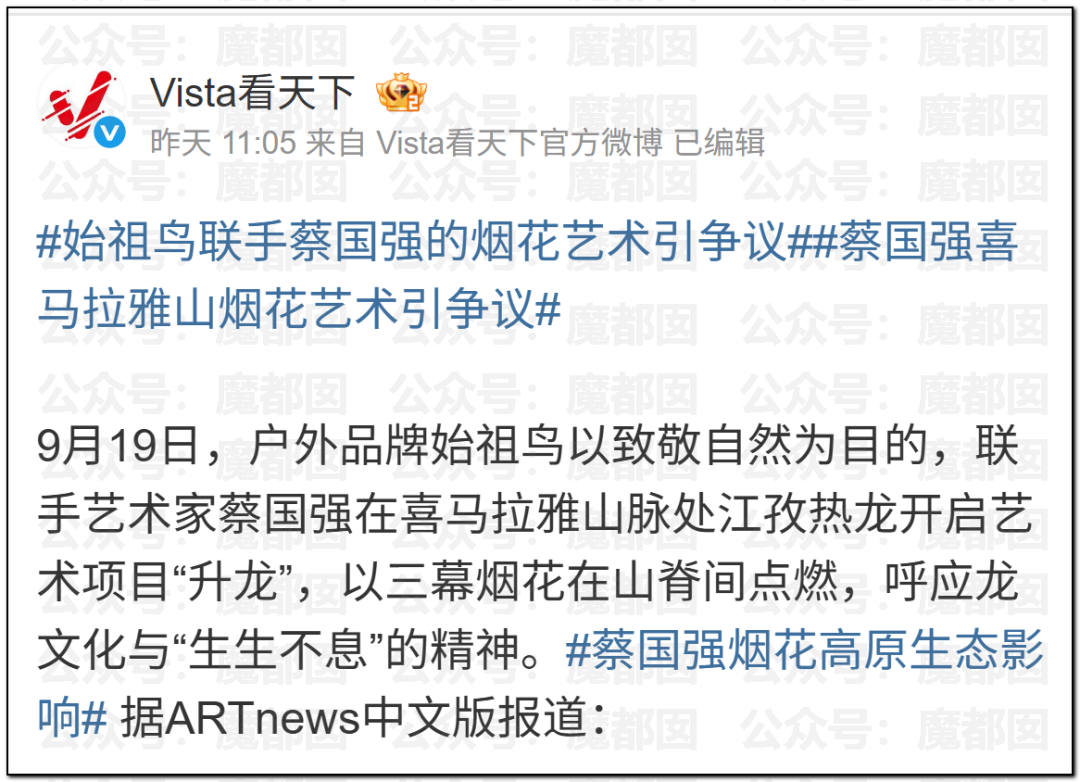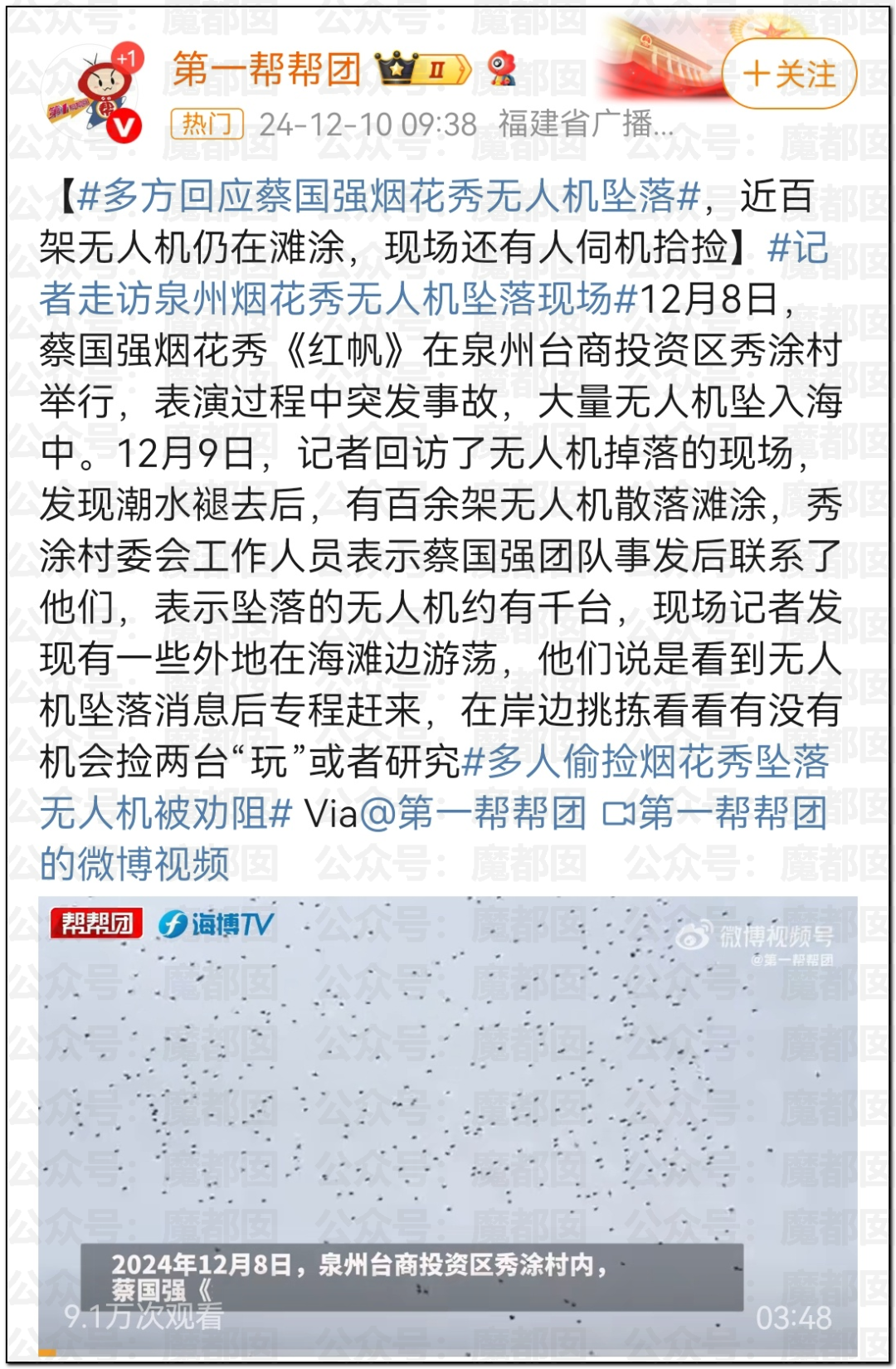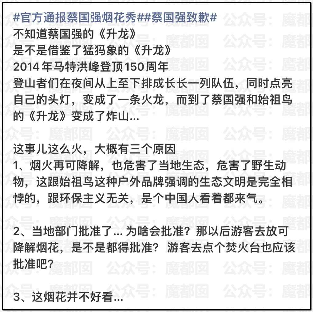 关于这个蔡国强其实非常抽象,从头到尾就很抽象,而且他是连续第二次翻车了,上一次泉州表演无人机没报备,起飞后大规模掉落,这次是跑到自然风景区。