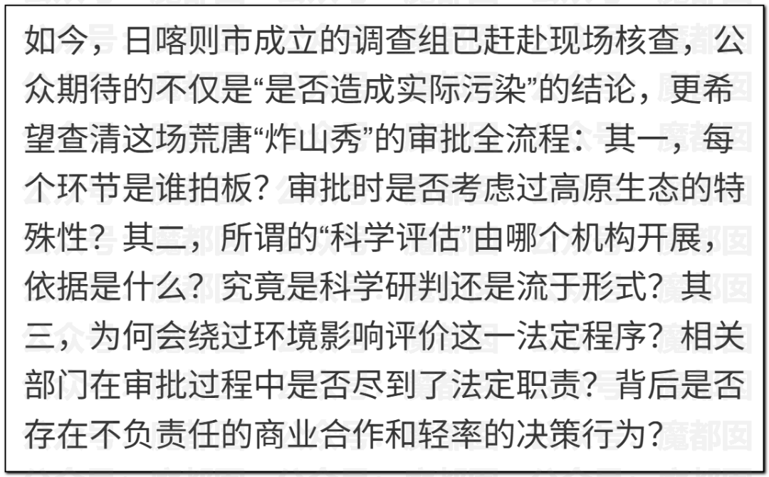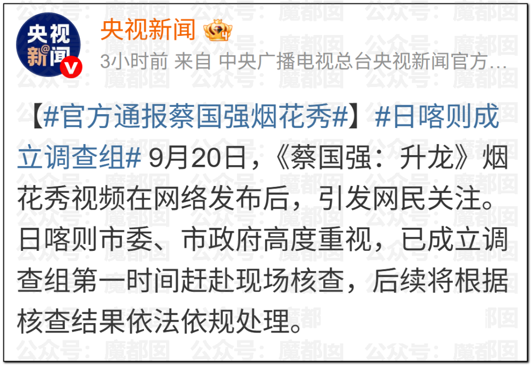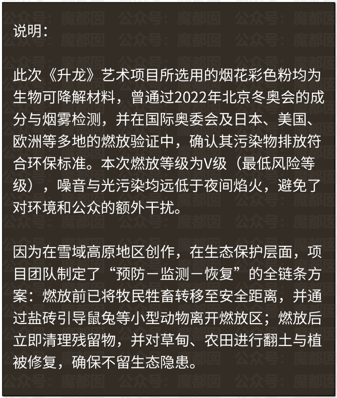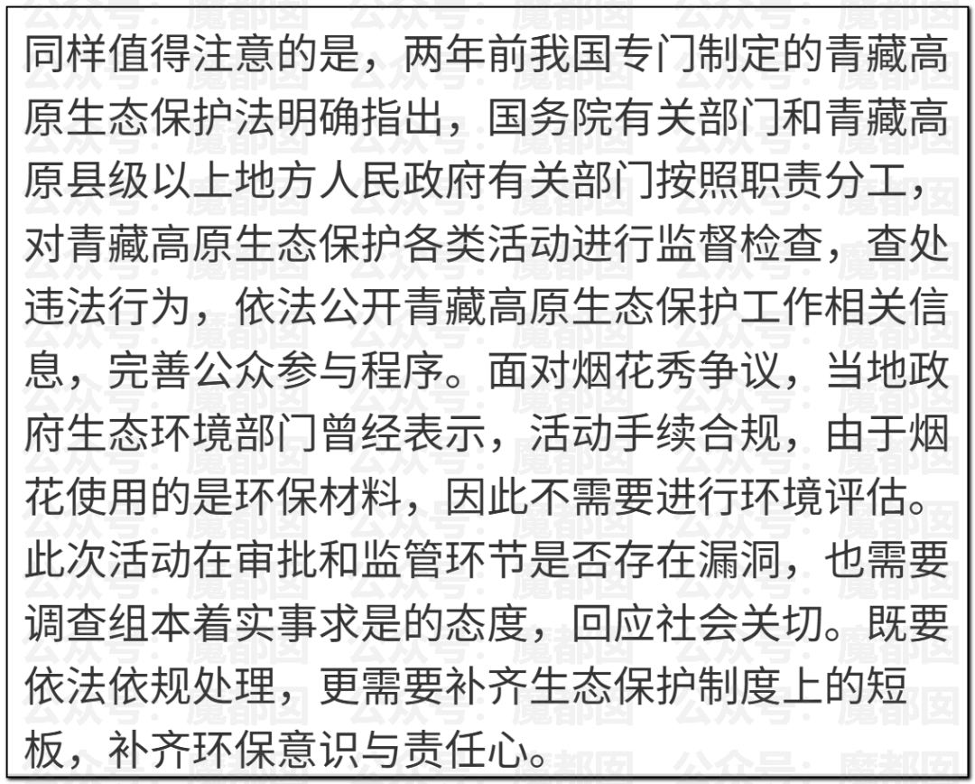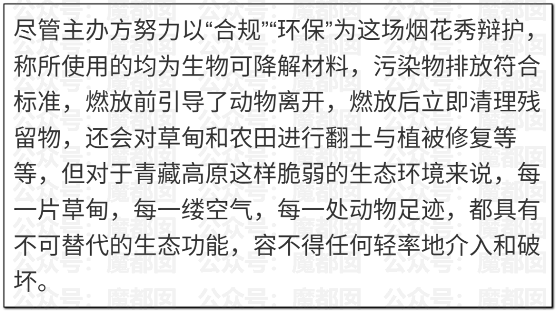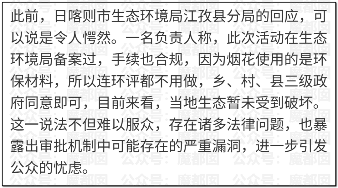 另据媒体报道,20日,日喀则市生态环境局江孜县分局一位负责人告诉记者,此次活动在生态环境局备案过,手续也合规,由于烟花使用的是环保材料,因此不需要进行环境评估,乡、村、县三级政府同意即可。政府此前开过多次会议,研究选址,评估调查周围有哪些野生动物等,最终的选址不属于生态保护区,周围无人居住。目前来看,当地生态暂未受到破坏,后续也会持续观察。