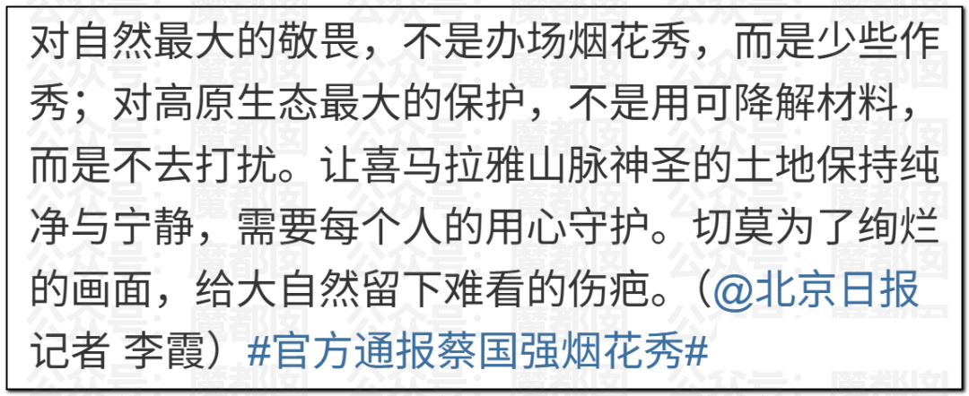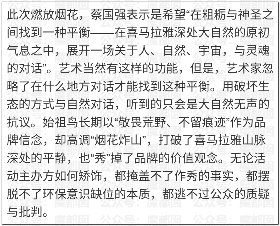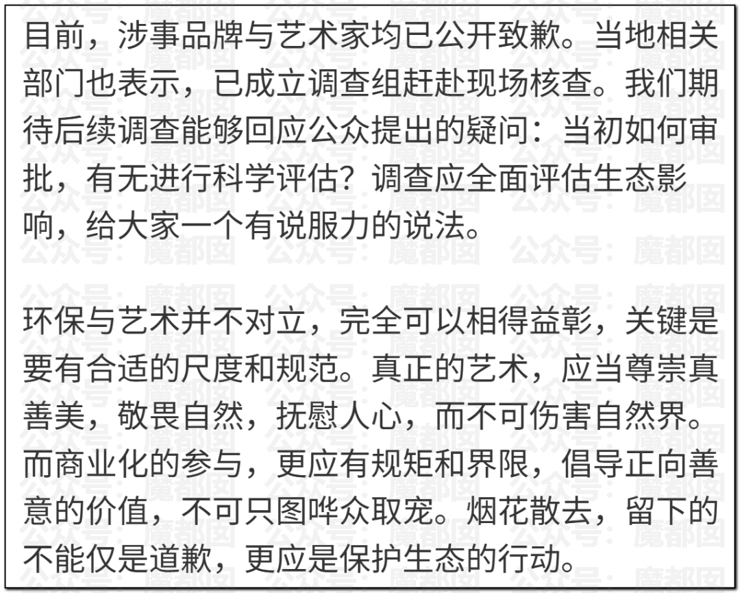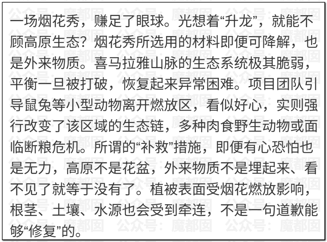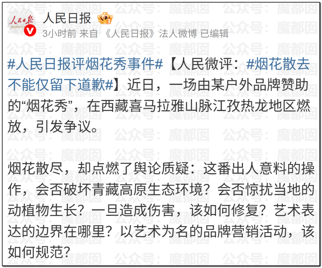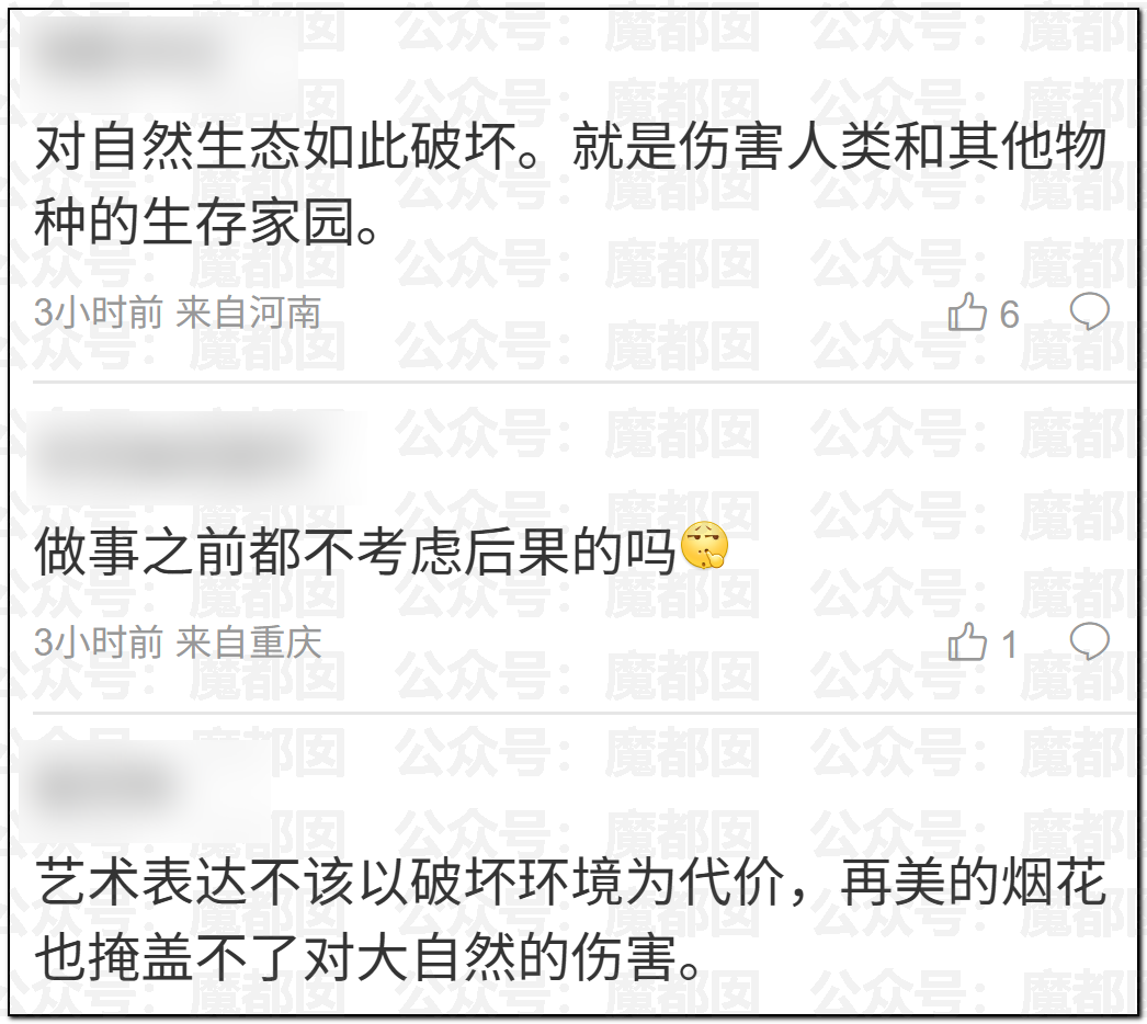 自然和人类共享一个共同家园,“先破坏后补救”从来都是行不通的,更何况是一次为了流量的商业营销。别拿“艺术”和“合法”来堵悠悠众口了,雪山不是秀场,炸错了地方的烟花再美也是破坏,再火也只会令人反感。