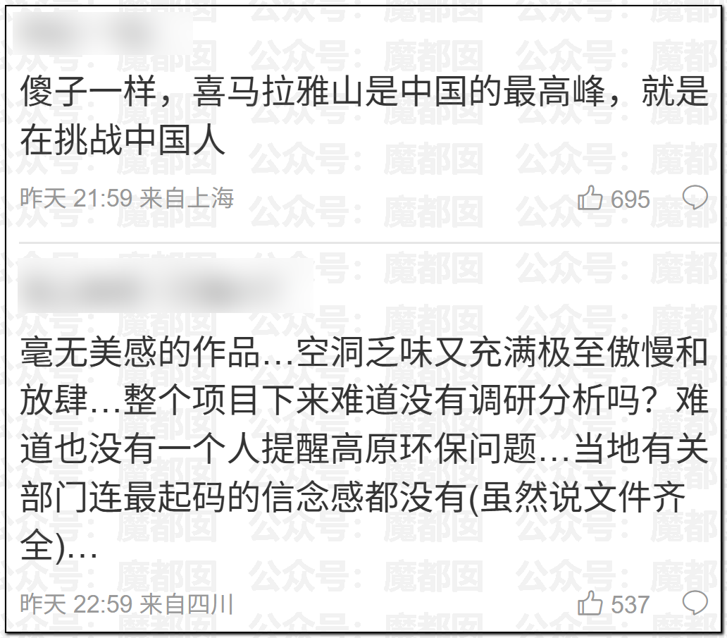 虽有此公告,该行为仍引起巨大争议。由于项目所处在喜马拉雅山脉,该地的自然环境本身脆弱,不少网友及户外爱好者对该艺术项目环保材料的实际效能、对高原土壤与植被的物理干扰、对野生动物的干扰以及对大气和水体的潜在污染等均表示质疑,并认为团队应对此项目的环保措施作更详细的说明及公示。、