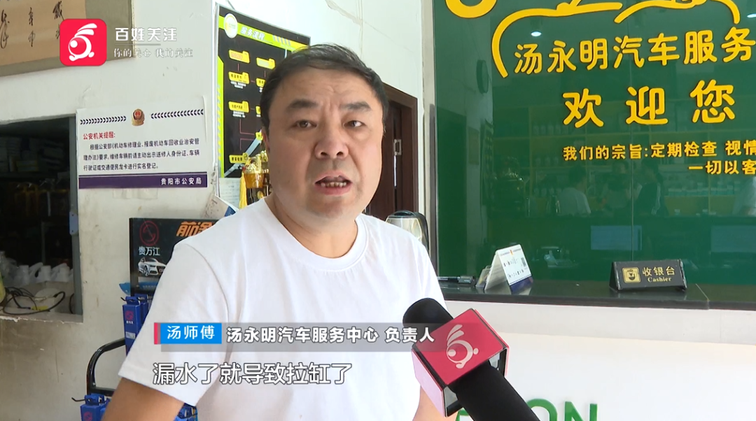 汤师傅汽车服务中心负责人 汤师傅:他的发动机漏水导致拉缸,我们处理了高温漏水故障。当时就跟他说了,我们包十年二十万公里,但必须在我们这儿换机油,两年两万公里换一次。他用了自己带来的机油,拒绝使用我们的机油,导致发动机其他部位损坏。