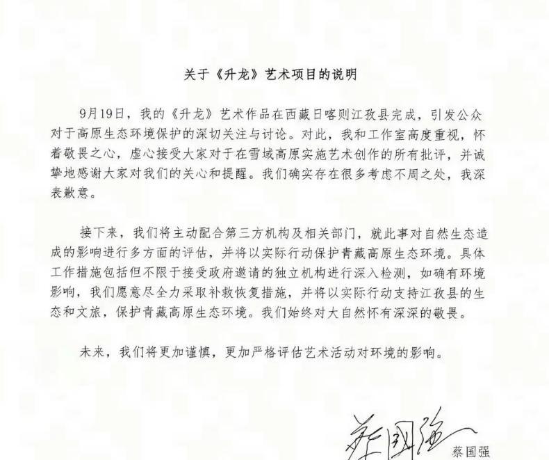 面对巨大的舆论压力,始祖鸟和蔡国强于今日凌晨分别发布了道歉声明,表示愿意配合第三方机构和相关部门,全面评估此次活动对环境的影响,并承诺将尽全力进行补救。然而,这份道歉声明非但没有平息众怒,反而让质疑声更加高涨。