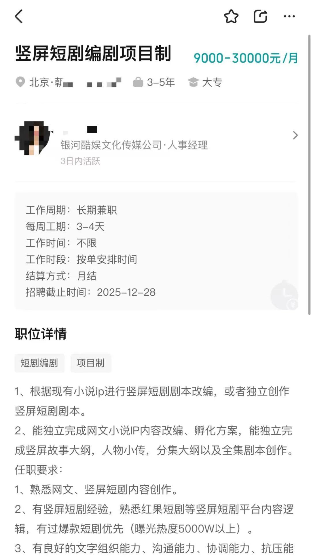 进一步分析岗位要求,银河酷娱计划根据接收的竖屏短剧单量,灵活为兼职编剧安排项目。这一举措既体现了公司对竖屏短剧市场的谨慎探索,也显示出其在资源调配上的灵活性。