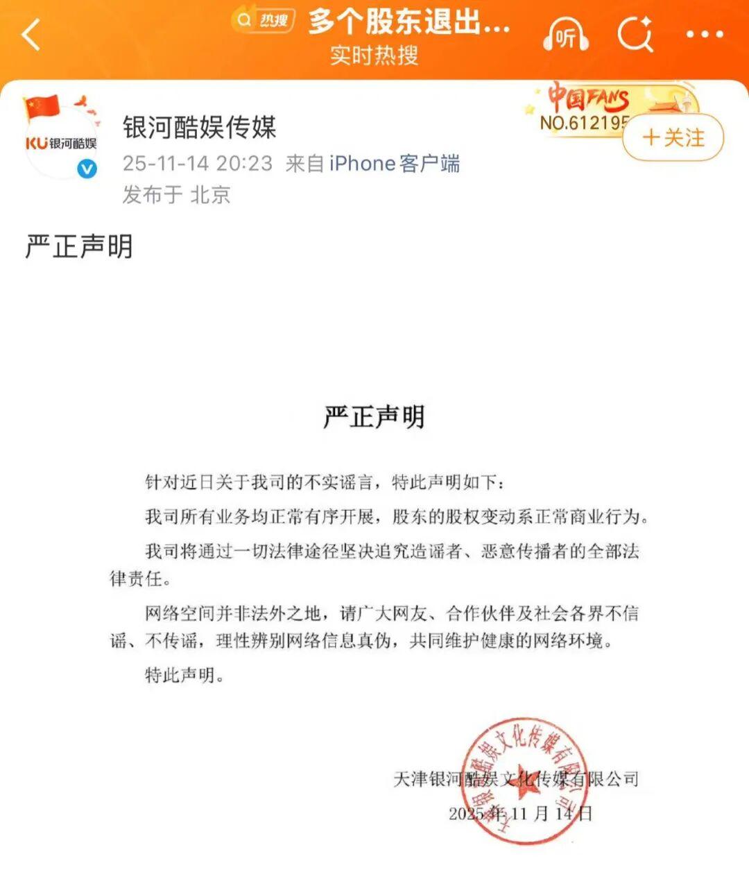 值得注意的是,尽管与赵露思解约后,银河酷娱曾一度陷入破产传闻的漩涡。11月8日,赵露思工作室官微删除“银河酷娱”标识,且IP地址显示四川,这一举动被外界猜测双方已正式解约。紧接着,11月14日,工商信息显示银河酷娱多家股东退出,其中退出股东最高股权占比达12.27%,这一系列变动无疑加剧了外界的猜测。