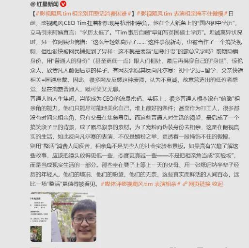 文章中,红星新闻还提到,有网友认为Tim的这种表演,既可笑又无聊,是在消费普通人。同时,红星新闻还指责Tim此举是媚粉之举,透着一股掩饰不住的傲慢,并建议Tim别用整活消费人间疾苦,相亲角不是某些人的社会实验背景板。