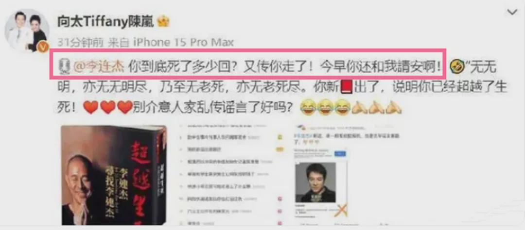 当时,“李连杰健康状况恶化”的消息不胫而走,向太帮他辟谣,甚至李连杰也亲自现身辟谣,说自己患上甲亢,在调理身体。