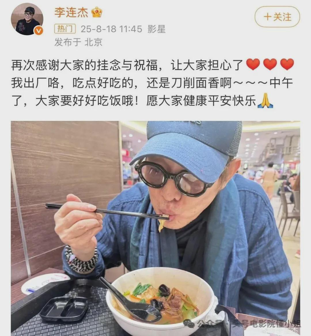 8月17日说自己“硬件出点问题”,8月18日中午,李连杰就更新社交账号,晒出自己最新的吃刀削面照片报平安。