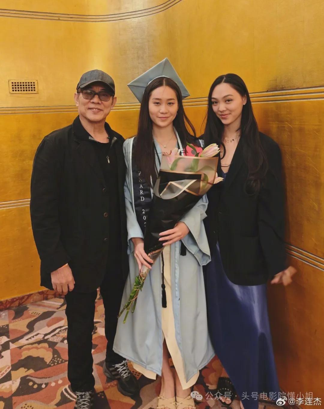 今年5月,李连杰在社交账号上发文,晒出自己参加小女儿Jada在大学毕业典礼的合影,恭喜他的四个女儿(和前妻黄秋燕两个女儿:李思和李苔蜜,和现任妻子利智两个女儿:Jane和Jada)全部都大学毕业。