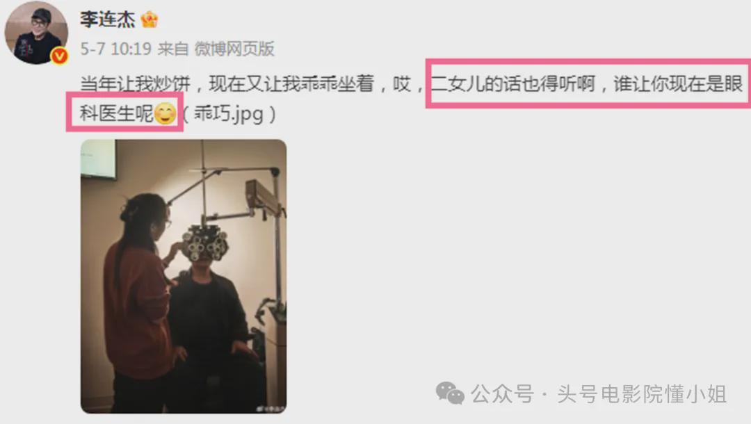 就在5月初,李连杰还晒过自己和二女儿的合影,照片中,他坐着检查视力,身边是已经当上眼科医生的二女儿。