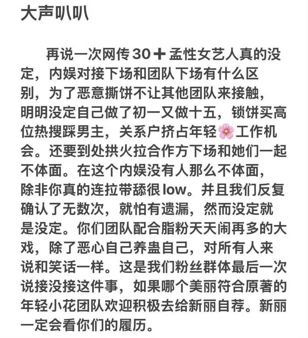 一边喊着“网传30+孟姓女艺人真的没定!反复确认无数次,没定就是没定”,吐槽对方锁饼踩人、拱火不体面,呼吁年轻小花主动自荐;