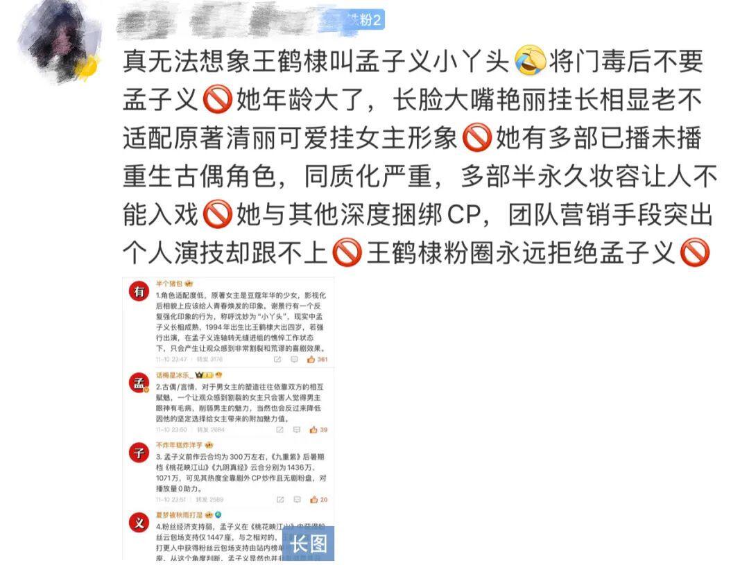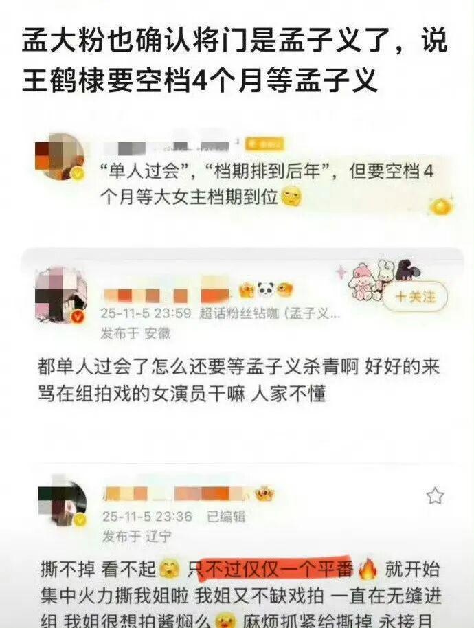 孟子义粉丝也不甘示弱,回怼“王鹤棣和书中的谢景行也差着十万八千里”的同时,也不忘死死咬住番位不放,强调:“原著是女频,核心就是大女主重生复仇,要官宣就得平番,凭啥让我姐做二番?”