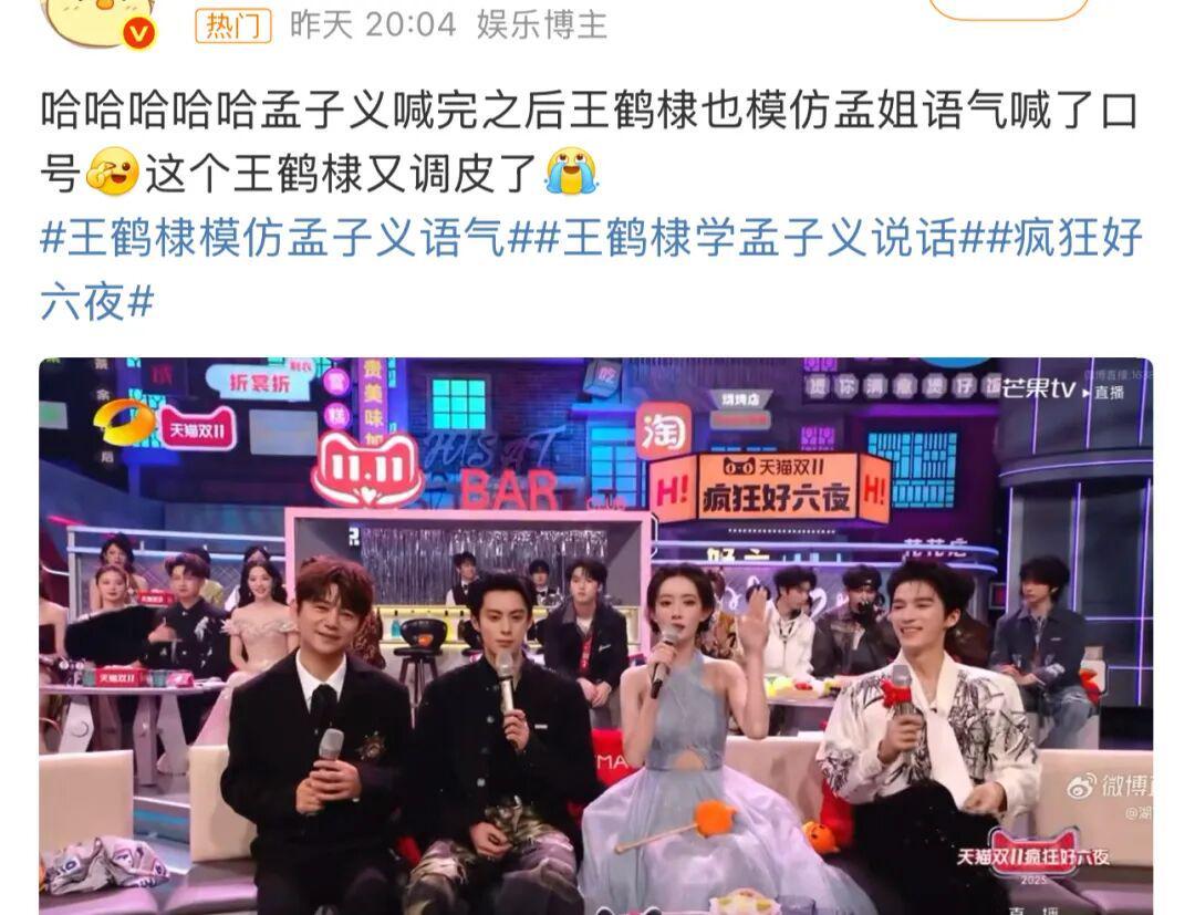 尽管线上抵制声浪震天,昨晚两位正主在《疯狂好六夜》却依旧表现得浑然无事,不仅大大方方同框互动,王鹤棣还现场模仿起孟子义的说话语气,逗得她当场害羞低头。