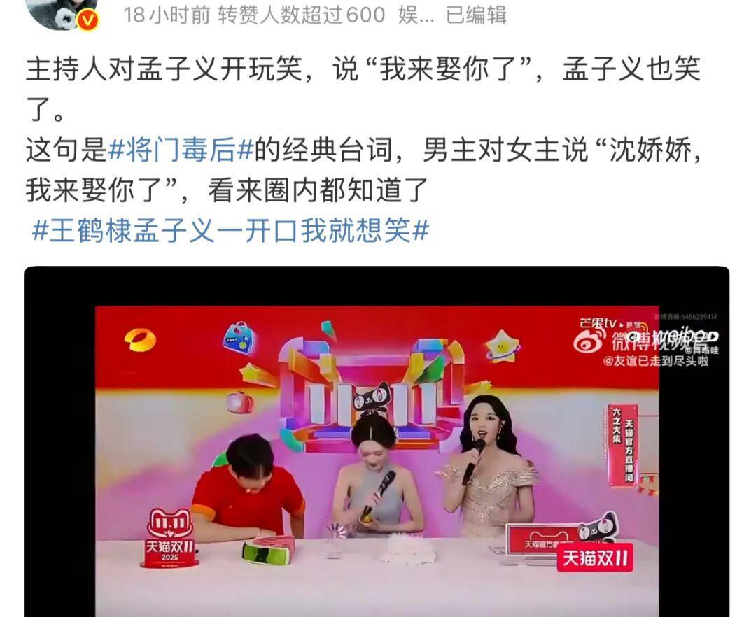 更有主持人适时加入战场,对着孟子义精准抛出原著中的经典台词“我来娶你了”。