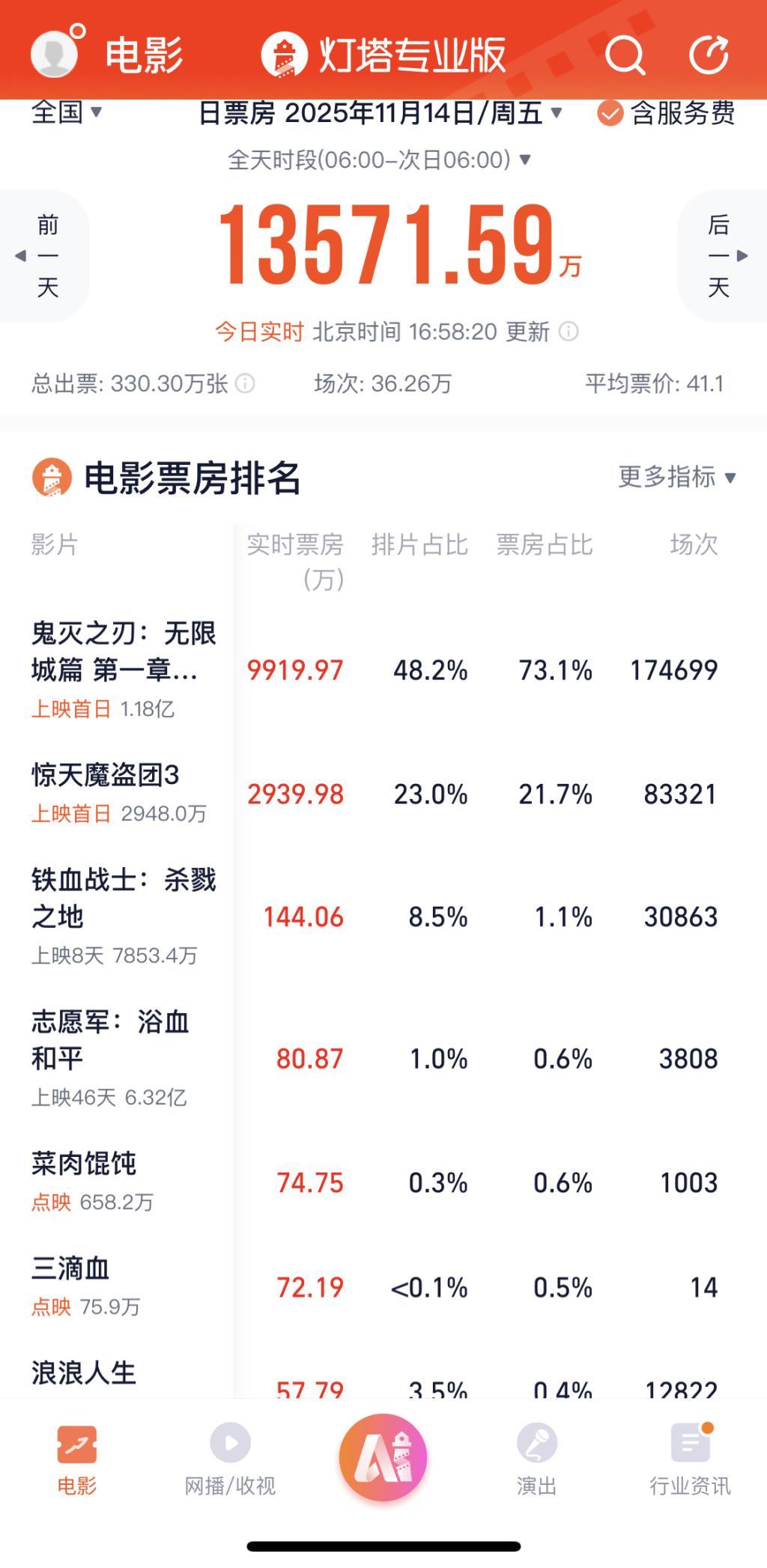 2025年11月14日票房,截至下午5时前
