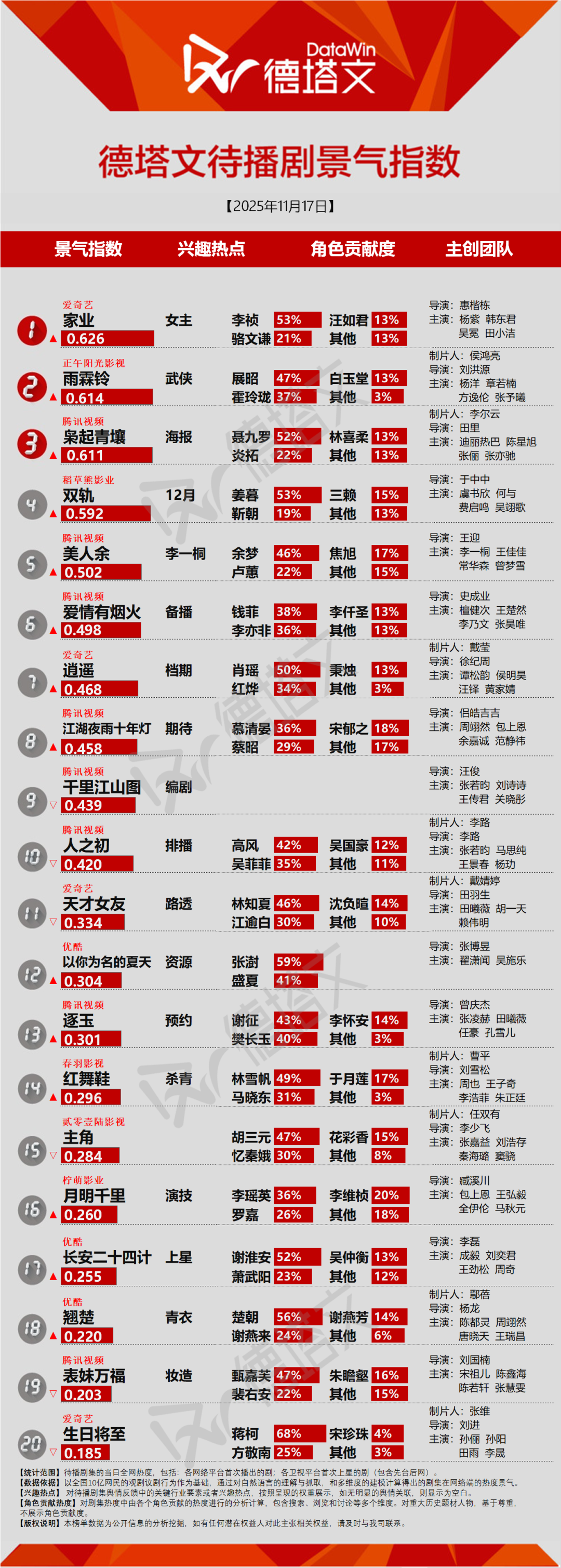 家业(李祯53% 骆文谦21%) 雨霖铃(展昭47% 霍玲珑37%) 枭起青壤(聂九罗52% 炎拓22%) 双轨 美人余 爱情有烟火 逍遥 江湖夜雨十年灯 千里江山图 人之初 天才女友 以你为名的夏天 逐玉 红舞鞋 主角 月明千里 长安二十四计 翘楚 表妹万福 生日将至