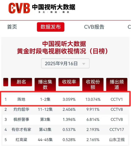 “笔墨为刀枪,文心筑长城”“文科生必看,这才是文化人该有的抗战”……自9月16日登陆央视一套黄金档以来,文化抗战剧《阵地》迅速掀起观剧热潮。中国视听大数据显示,该剧首播收视率高达3.059%,收视份额13.074%,强势登顶同时段全国收视榜首,成为2025年首部首集收视即破3%的革命题材剧,被观众誉为“最具文化气息的抗战剧王炸”。