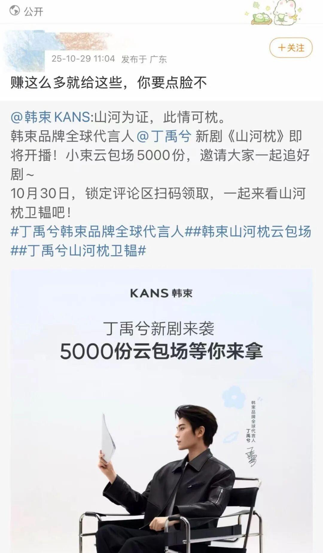 《山河枕》未播先热,丁禹兮粉丝集体涌入韩束官方微博,以“代言人不包场说不过去”为由施压。最终韩束不得不宣布包场10万份会员,相关微博评论区被粉丝“感谢金主爸爸”的留言刷屏。