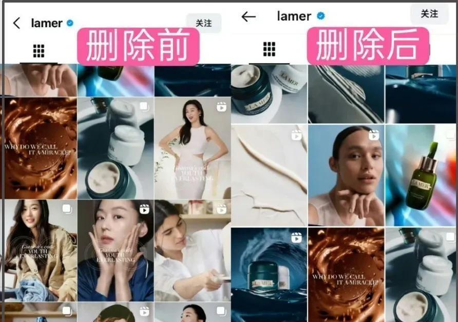 面对汹涌舆情,其合作品牌迅速做出反应。高端护肤品牌海蓝之谜率先删除其在国内社交平台的所有宣传物料,但起初仍保留海外账号相关内容,遭到网民痛批“内外双标”。迫于压力,最终连外网内容也被全部下架。
