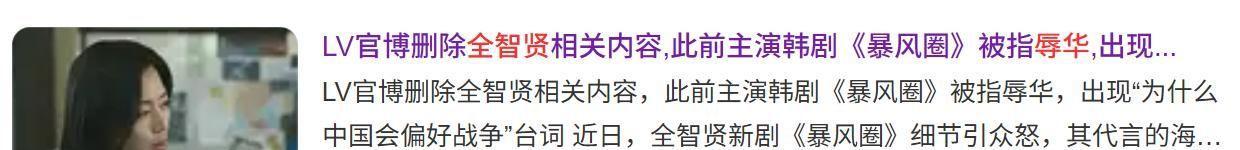4.荆楚网:LV官博删除全智贤相关内容,此前主演韩剧《暴风圈》被指辱华,出现“为什么中国会偏好战争”台词