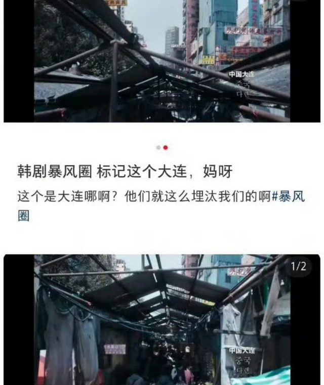 除了台词问题,剧中的场景设定也充满恶意。铺在地上被踩踏的红色地毯竟带有五角星图案,而标注为2025年的大连,镜头下却是破烂漏风的房屋、破旧的大三轮车以及发黑掉皮的墙壁,再加上阴间滤镜,直接将东北经济第一城的大连拍成了贫民窟。