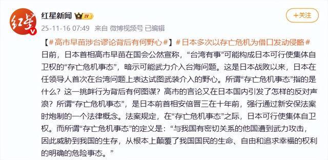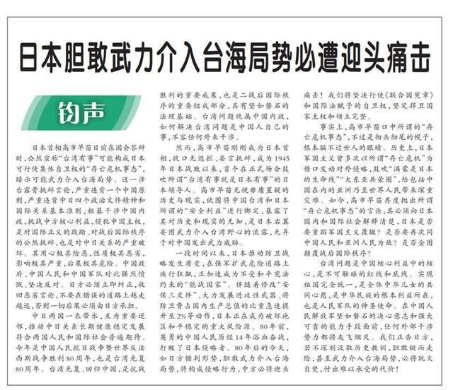 最令人愤慨的是,她将手伸向了中国的核心利益,将中国内政与日本“存亡危机”捆绑,暗示可能武力介入,本质上是对中国主权的粗暴干涉,对国际法的公然践踏。