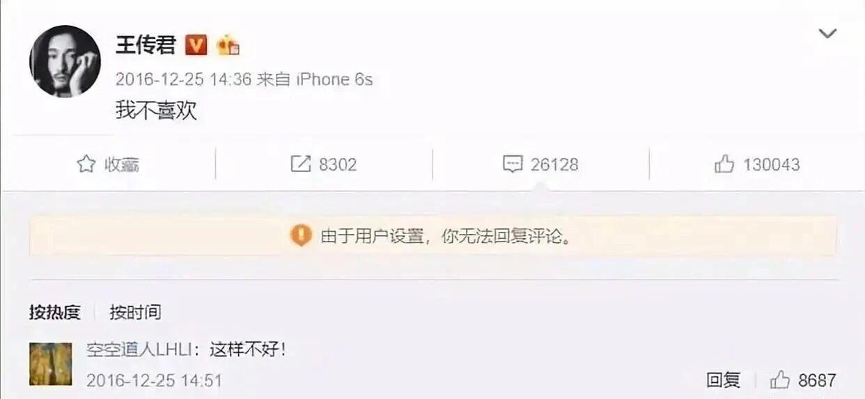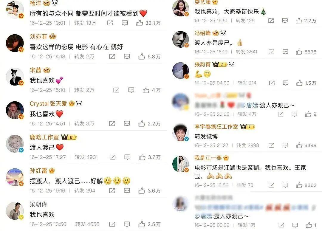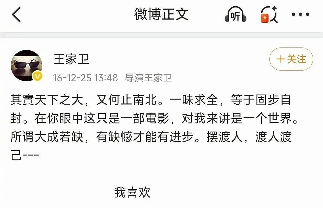 回顾2016年12月,王家卫监制的电影《摆渡人》上映后口碑崩塌。为了挽救票房,王家卫亲自发文表示“我喜欢”,随后梁朝伟、陈奕迅等一众大腕纷纷跟进表态“我也喜欢”。然而,在这场“我喜欢”的狂欢中,演员王传君却选择了“我不喜欢”这一截然不同的回应,引发了当时网友的广泛质疑,认为其情商太低。